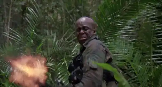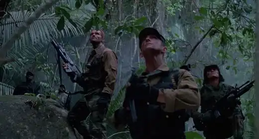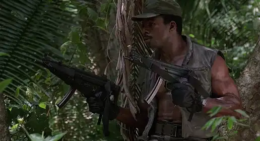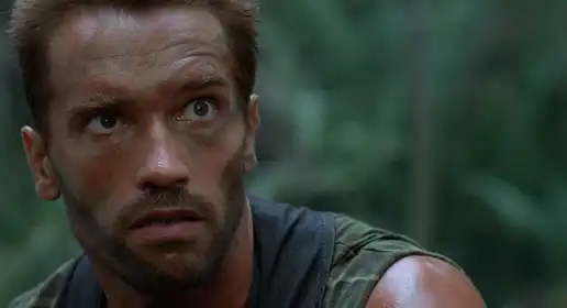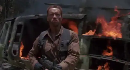Одна из самых очевидных и часто цитируемых «пасхалок» — фирменная фраза «Get to the chopper!», произнесённая Эшером в исполнении Арнольда Шварценеггера. Эта сцена стала почти меметичной: короткая, громкая и идеально подходящая под архетипический образ героя 80-х. Для зрителя 1987 года фраза работала не только в контексте сцены, но и как отсылка к той же культуре боевиков и к экранному образу самого Шварценеггера — сильный, прагматичный, немного комичный воин, у которого «все под контролем». Со временем эта реплика превратилась в один из символов фильма и неоднократно цитировалась и пародировалась в самых разных медиа, что само по себе стало мета-отсылкой к эпохе и стилю.